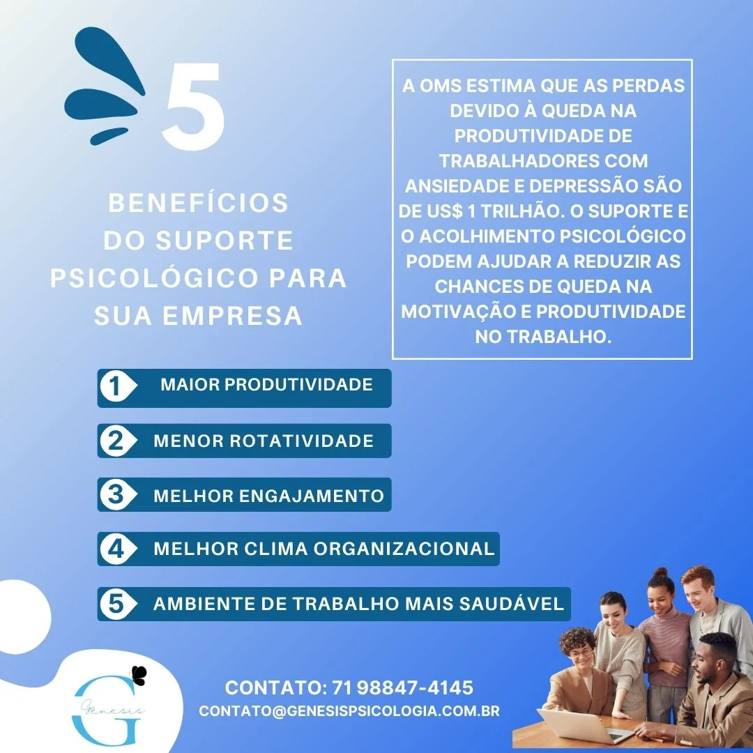 A Gênesis Psicologia é uma empresa que oferece atendimento psicológico presencial e online para adultos, além dos serviços de recrutamento e seleção, avaliação psicológica, análise de perfil comportamental e programa de atendimento psicológico para colaboradores de empresas conveniadas.