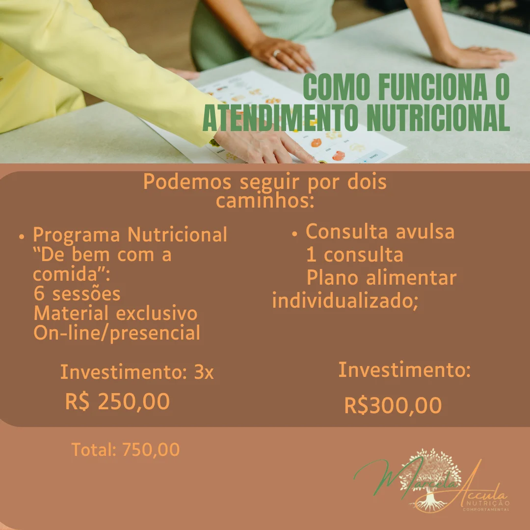 Presencial ou OnlineAcompanhamento de 3 meses com nutricionista, incluindo 6 sessões e material exclusivo.